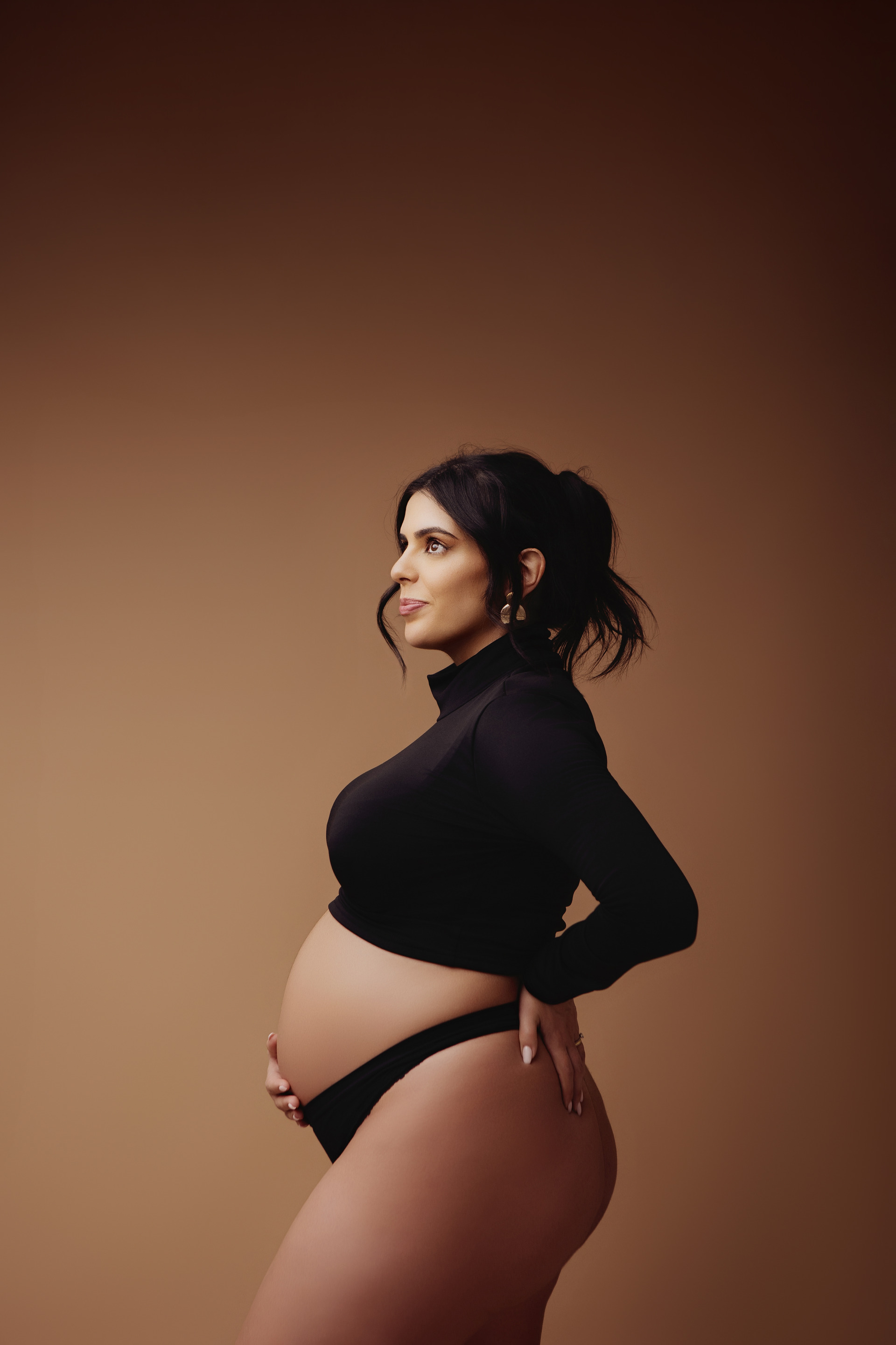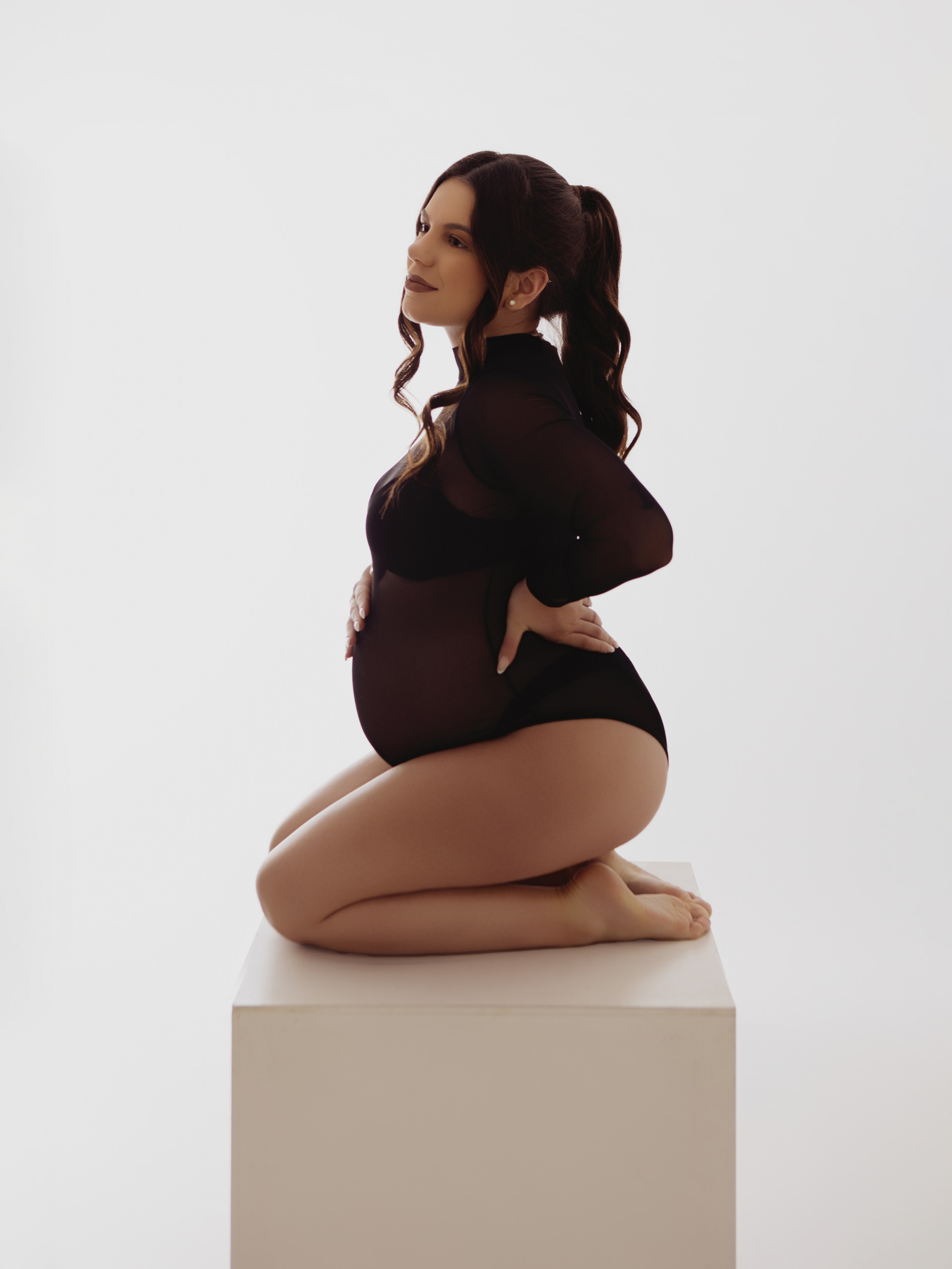 Nessa fase a barriguinha já está bem visível, mas não ao ponto de se tornar desconfortável realizar a sessão.